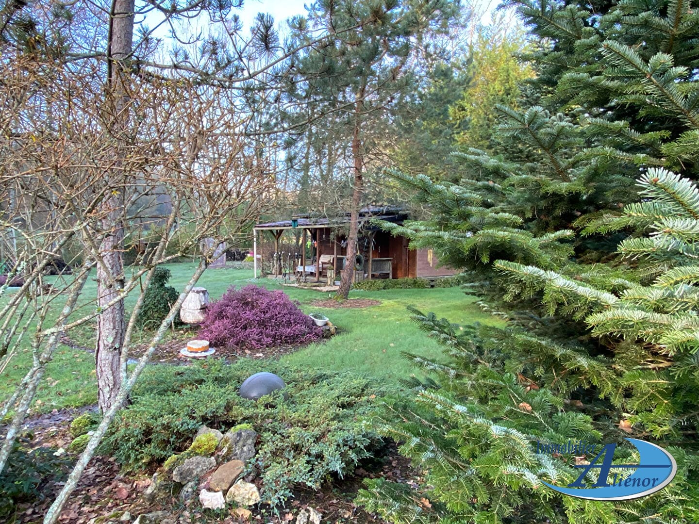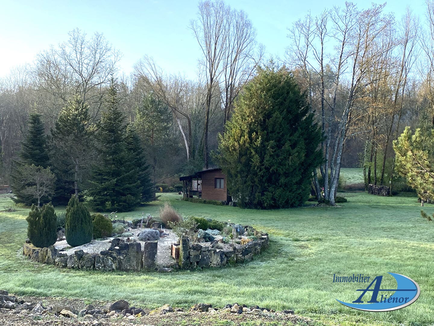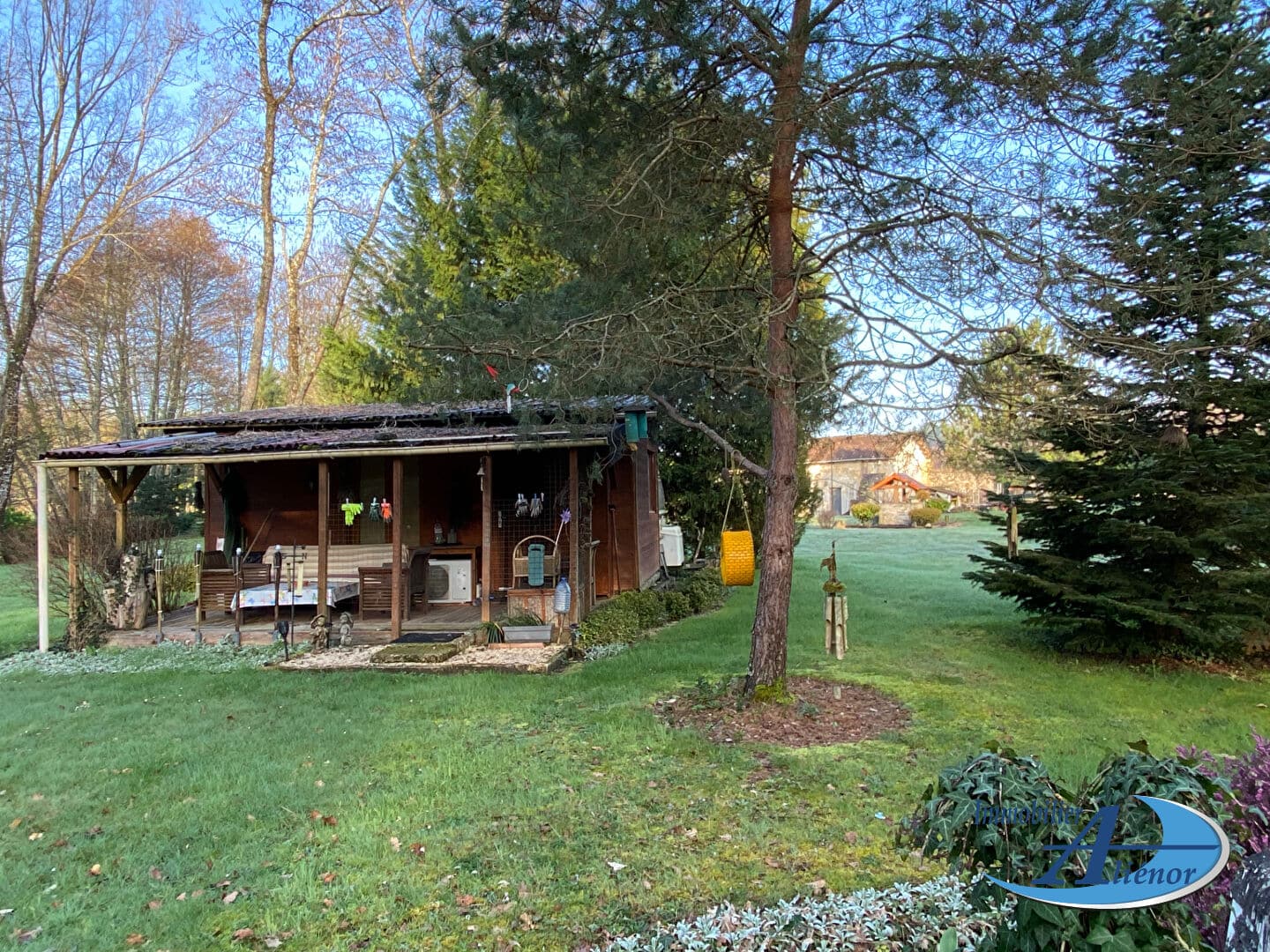 Caché dans le parc se trouve un abri en bois de 20m² qui est confortablement habitable pendant les travaux de rénovation.