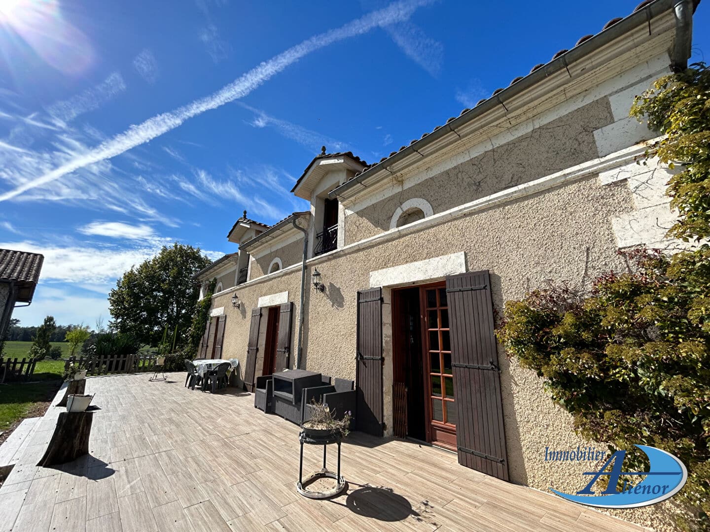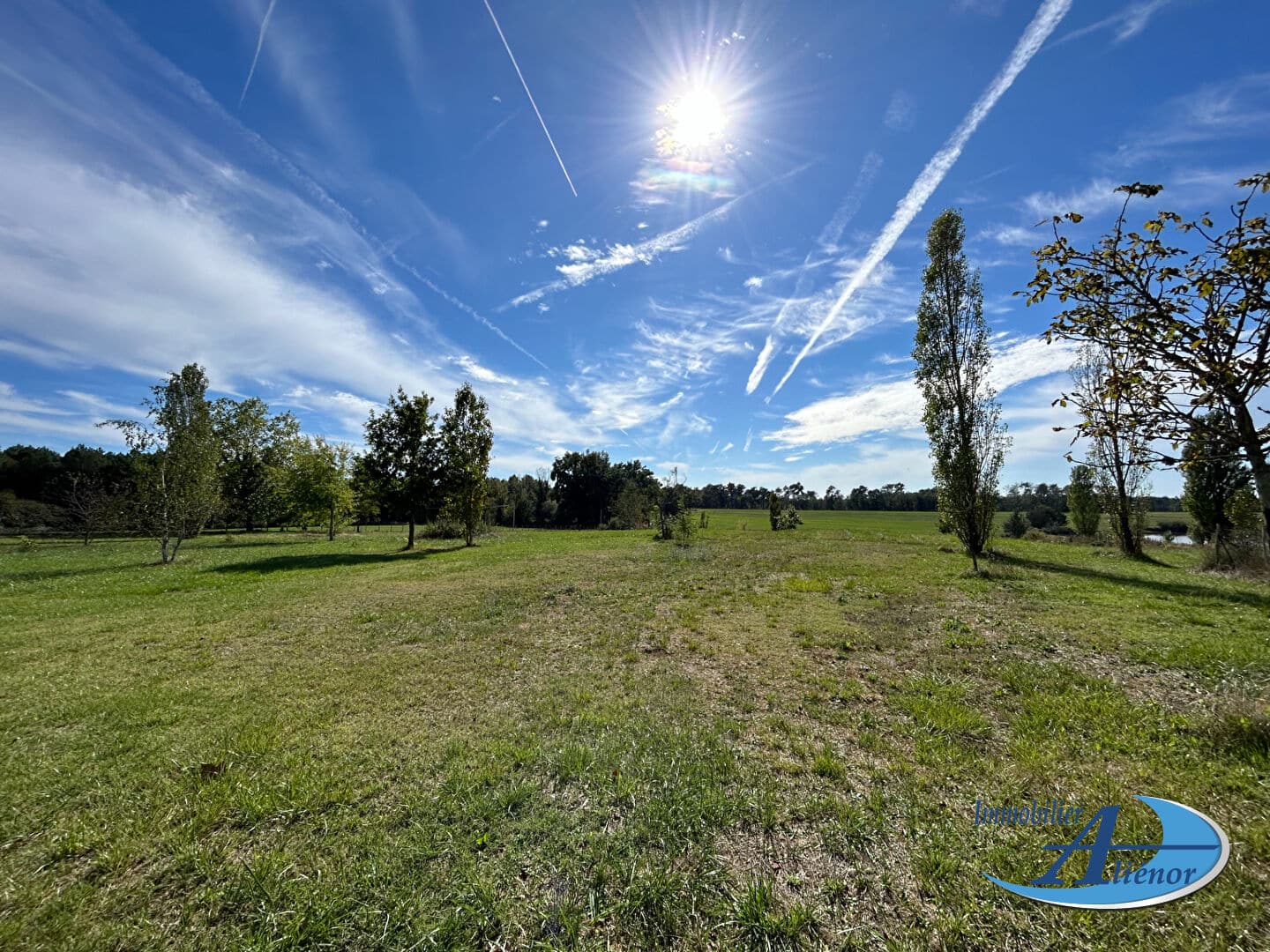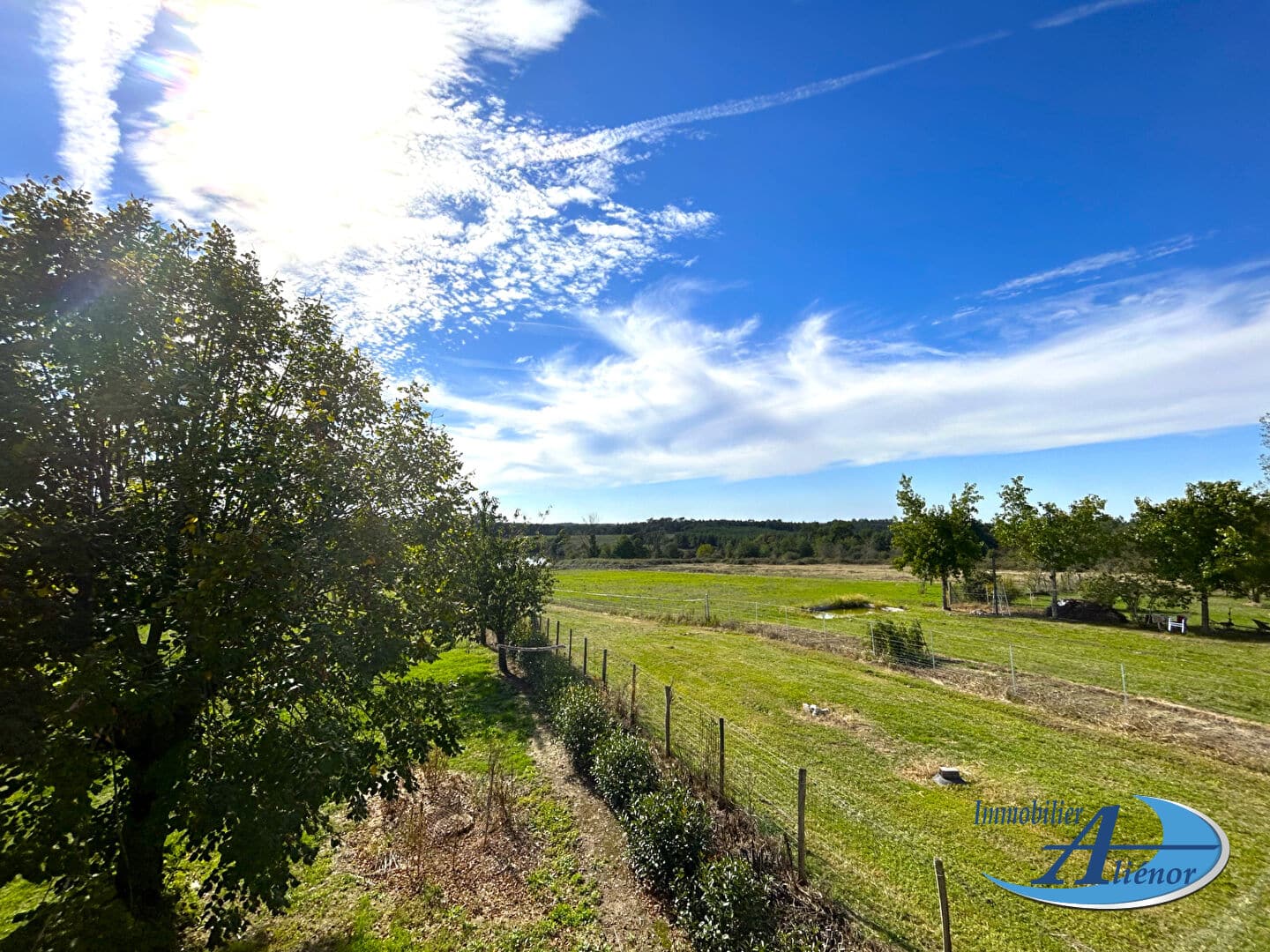 Le terrain est plat et arboré, offrant une vue panoramique verdoyante depuis la terrasse.
