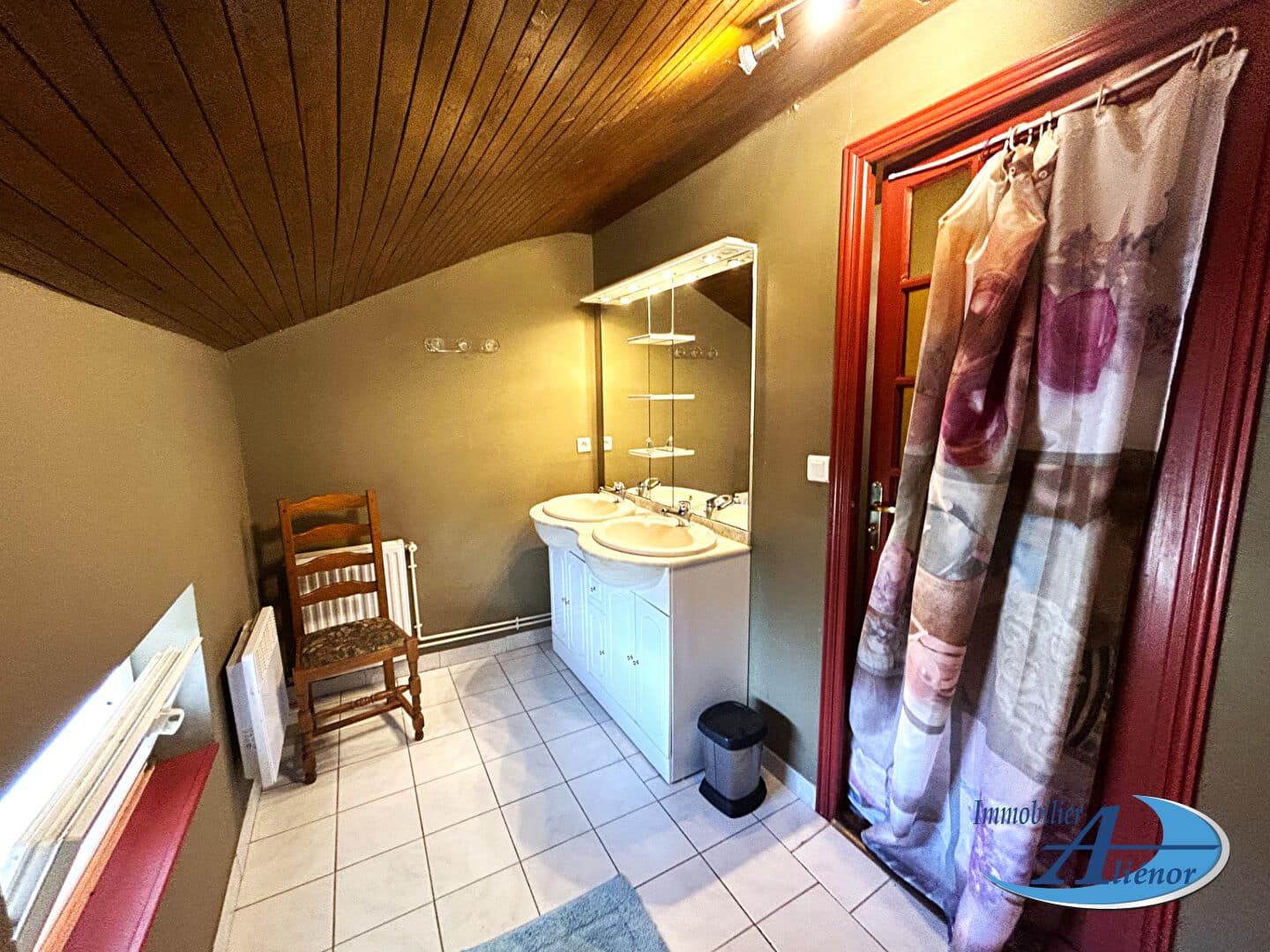 L’étage, offrant une vue splendide sur la forêt et les champs environnants, comprend 5 chambres avec sol parquet, une salle de bain, un W.C et un grand dressing/placard.