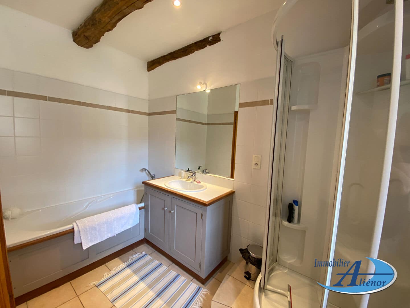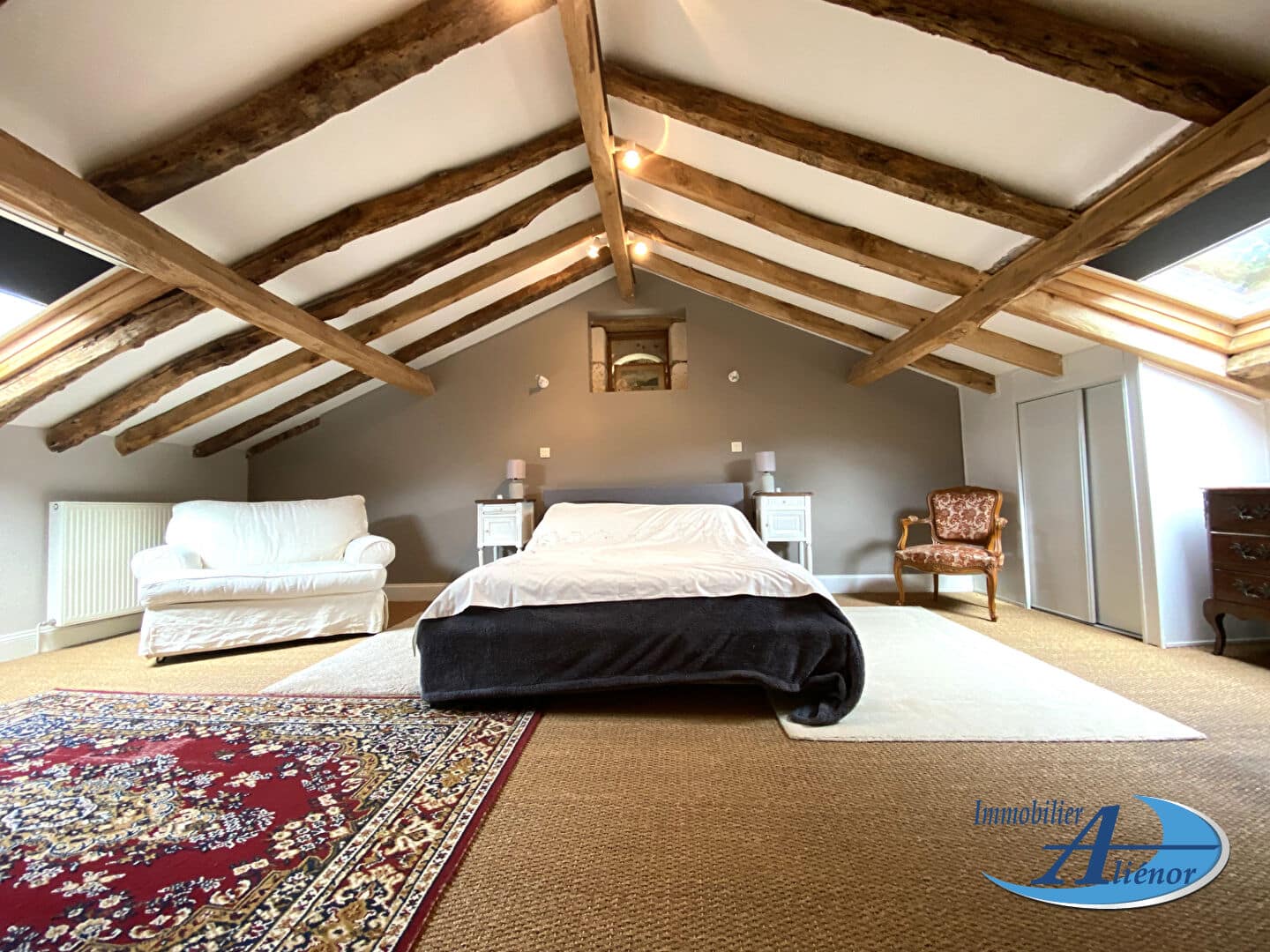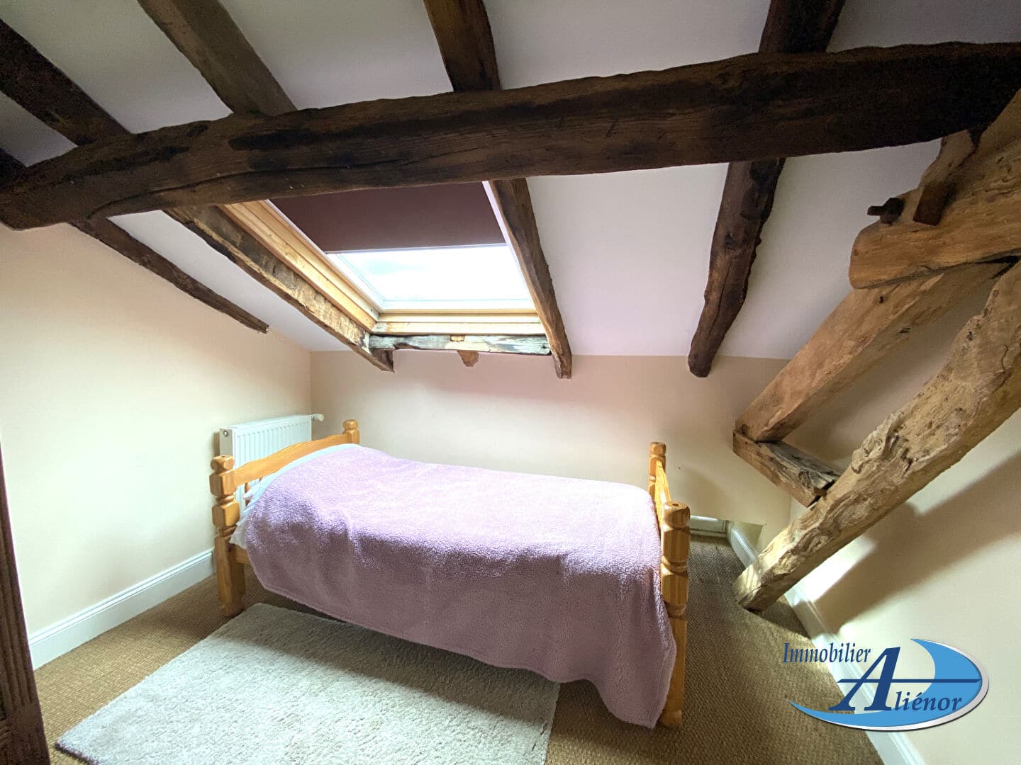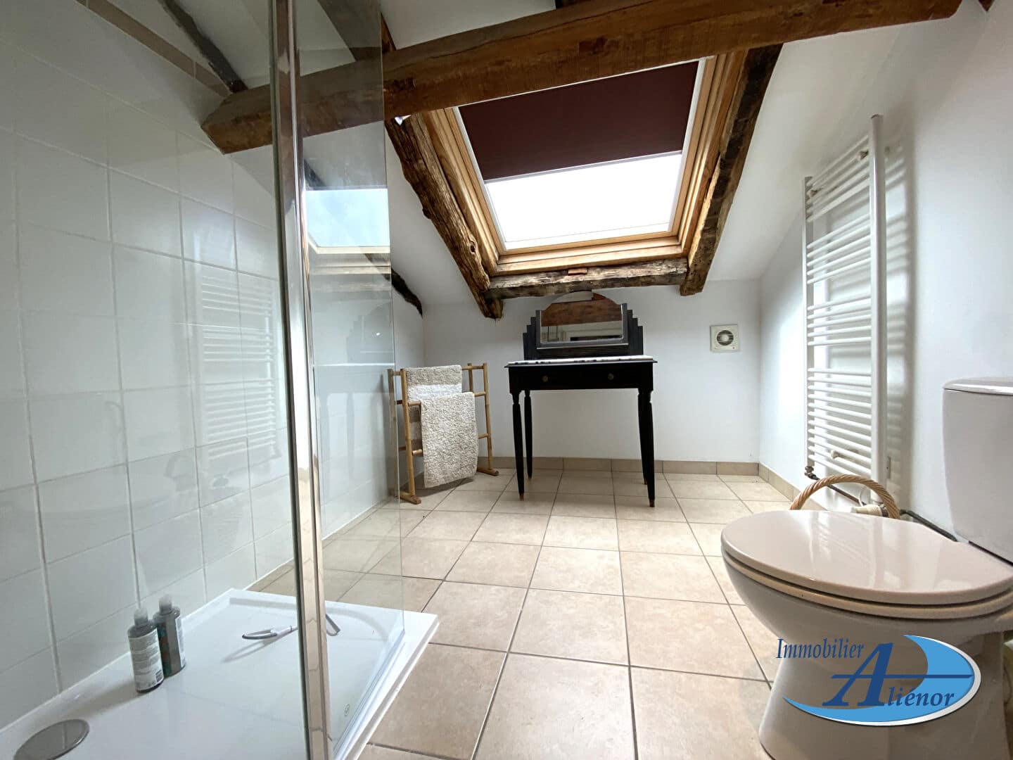 L’étage, tout aussi atypique, comprend une grande chambre sous combles, une autre double mansardée et une chambre simple. On y trouve également une salle d’eau avec cabine de douche et WC.