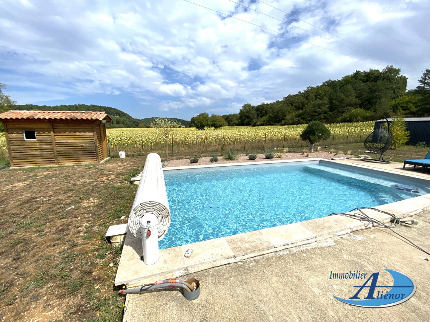 Cette jolie maison de 3 ou éventuellement 4 chambres dispose du chauffage au sol ainsi que d’une terrasse couverte donnant sur la piscine, avec belle vue sur la campagne.