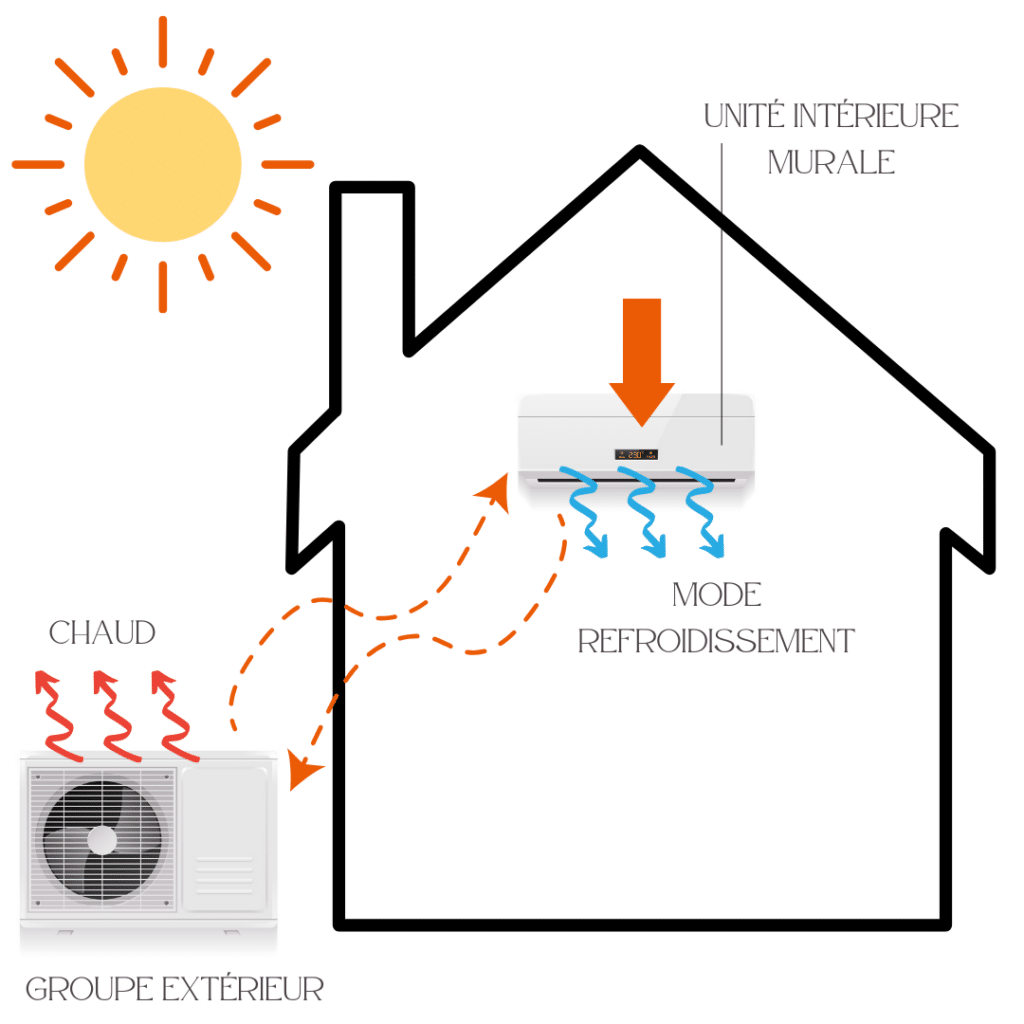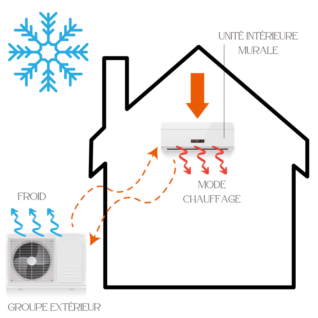 - Une pompe à chaleur air/air diffuse la chaleur directement dans l’air de votre maison à travers des unités intérieures (ventilo-convecteurs ou unités murales).