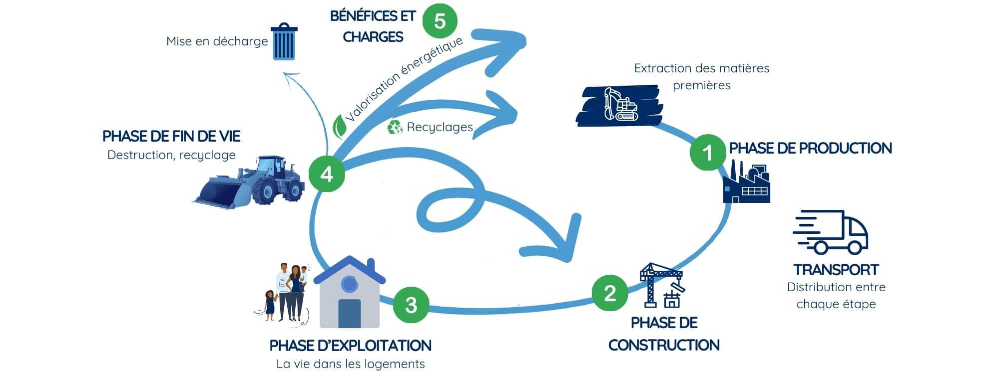 La différence majeure avec la Réglementation Thermique RT2012 est l’arrivée de l’Analyse de Cycle de vie (AVC), qui va permettre de calculer l’impact environnemental du projet de construction tout au long de son cycle de vie. En effet, le cycle de vie de votre futur nid douillet Maisons Aliénor englobe les impacts estimés de tous les matériaux et équipements utilisés dans le bâtiment, y compris les émissions de gaz à effet de serre dues au chantier de construction (engins, bases de vie, …) ainsi que le traitement des déchets qui en découle bien évidement le transport est inclut entre chacune des étapes.
