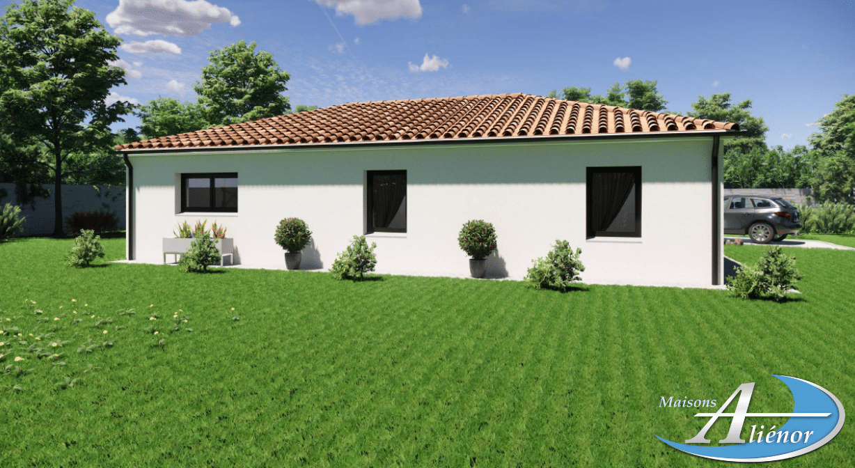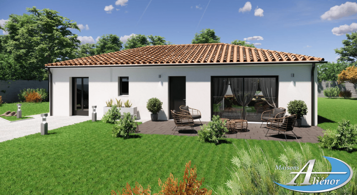Spécialiste de la construction de maisons en Dordogne, Corrèze & Charente, Maisons Aliénor vous présente son modèle de maison d’une superficie de 95.30 m², de plain-pied, généreuse, contemporaine et lumineuse, largement ouverte sur l’extérieur.
