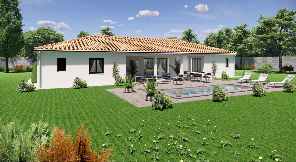 Spécialiste de la construction de maisons en Dordogne, Corrèze & Charente, Maisons Aliénor vous présente son modèle de maison d’une superficie de 123.60 m², de plain-pied, généreuse, contemporaine et lumineuse, largement ouverte sur l’extérieur.