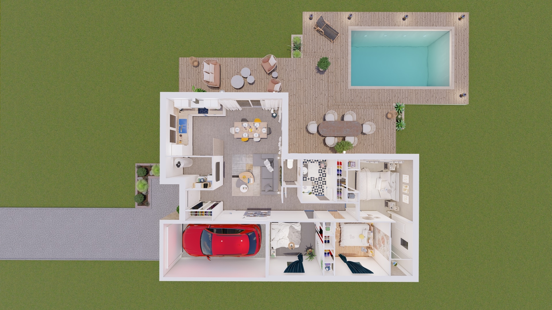 Cette maison moderne généreuse, contemporaine et lumineuse, largement ouverte sur l’extérieur se compose de deux espaces bien séparés permettant de distinguer les pièces de jour et celles de nuit.