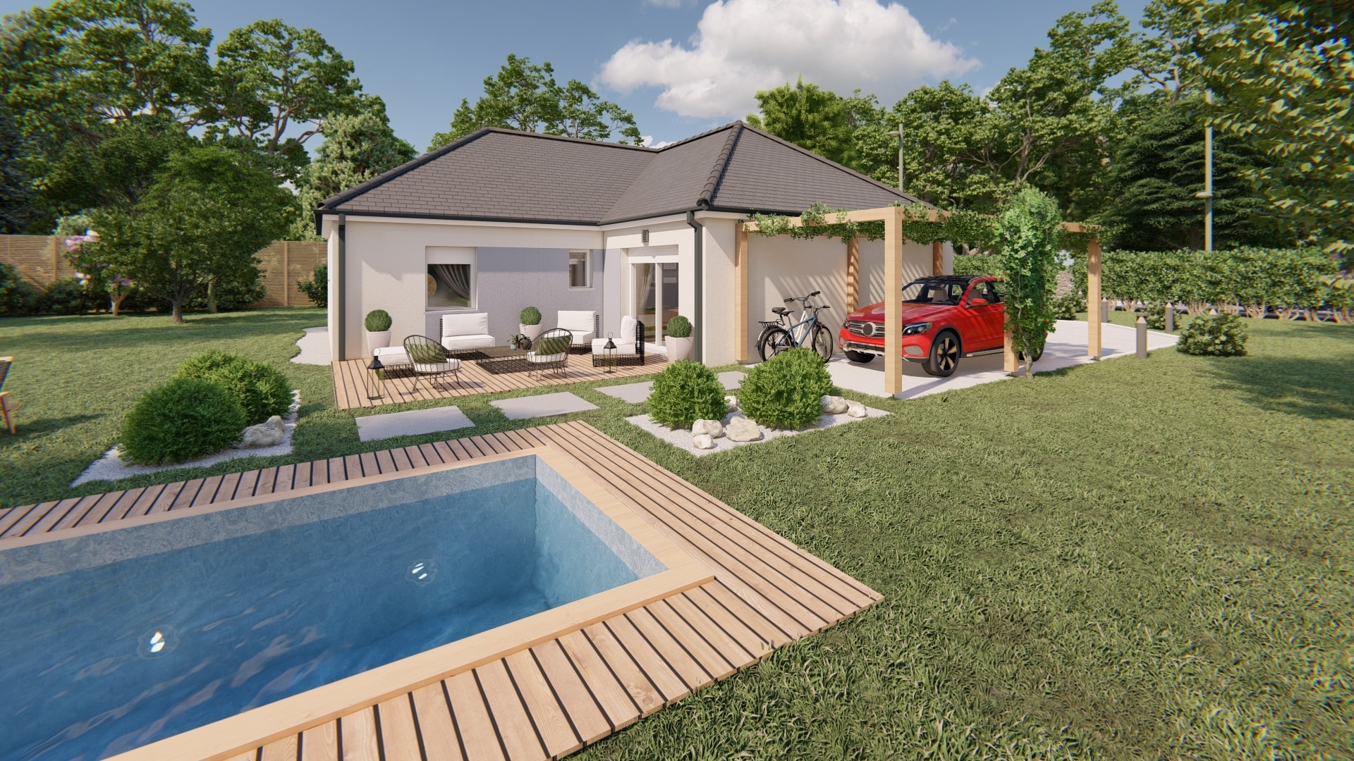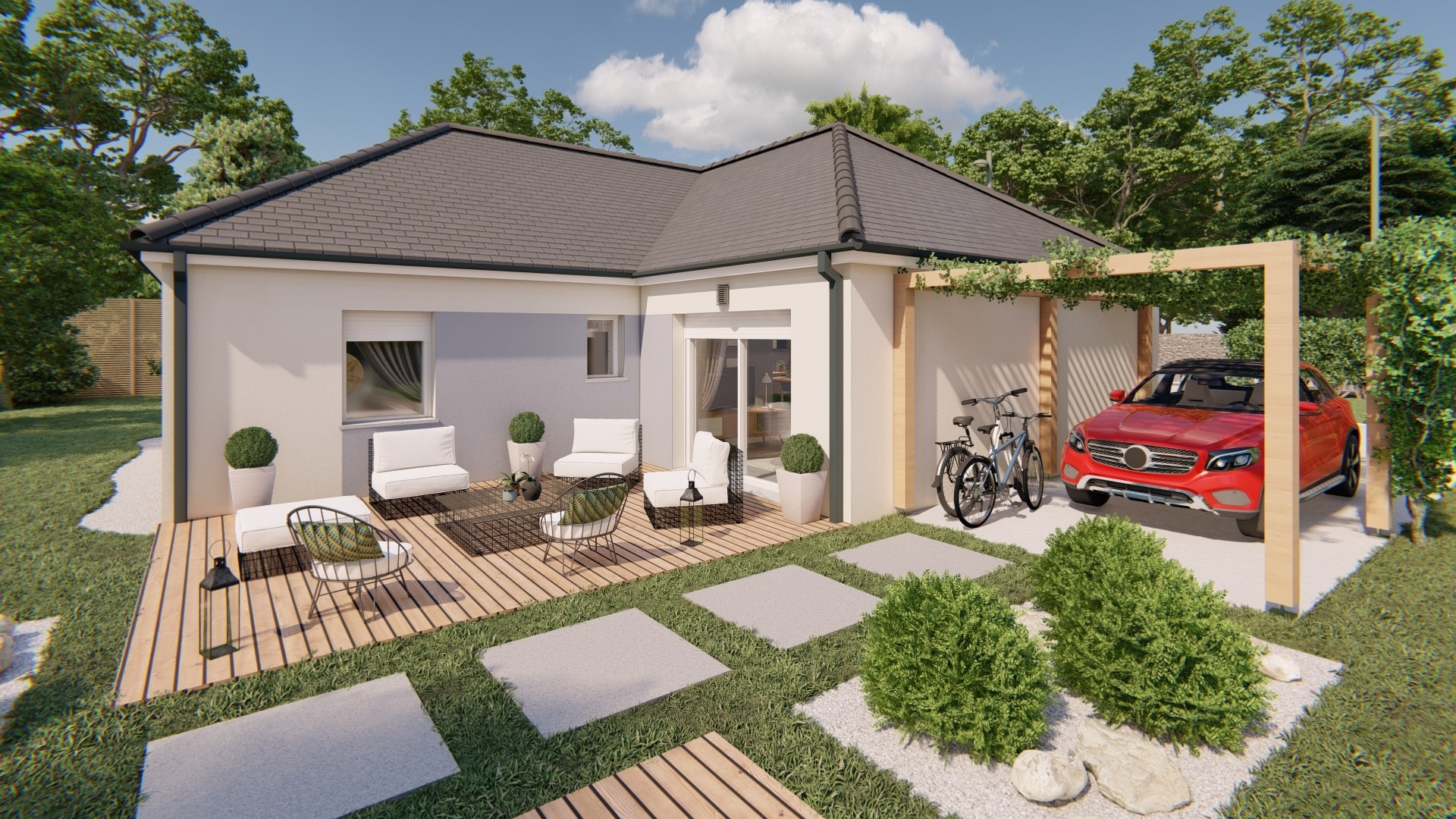 Ce modèle de maison plain-pied saura vous charmer ! La maison COLINE se décline en 10 versions différentes de plan allant de 80m2 à 120m2, avec 2, 3 ou 4 chambres avec ou sans garage.