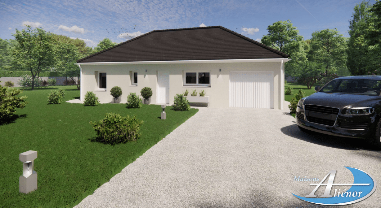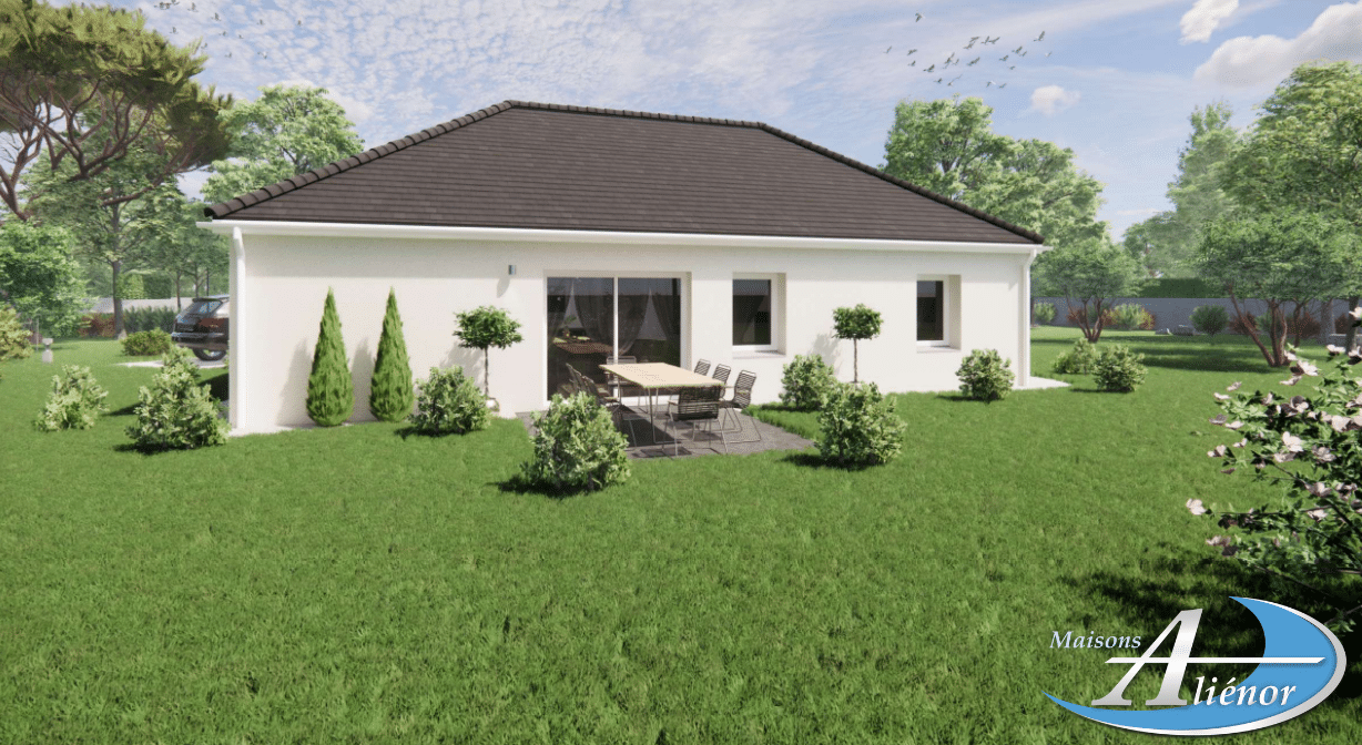Spécialiste de la construction de maisons en Dordogne, Corrèze & Charente, Maisons Aliénor vous présente son modèle de maison d’une superficie de 74.50 m², de plain-pied, généreuse, contemporaine et lumineuse, largement ouverte sur l’extérieur.